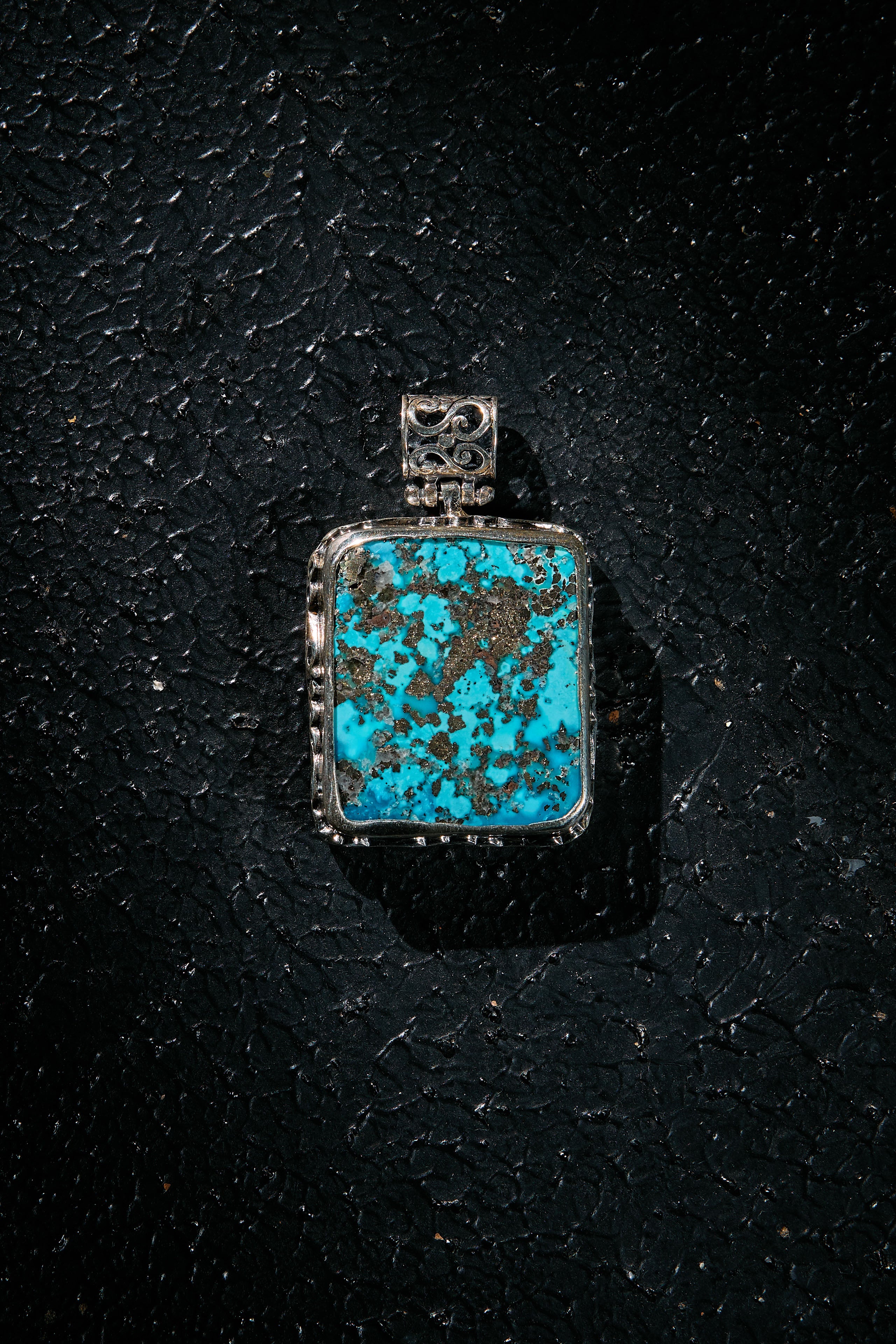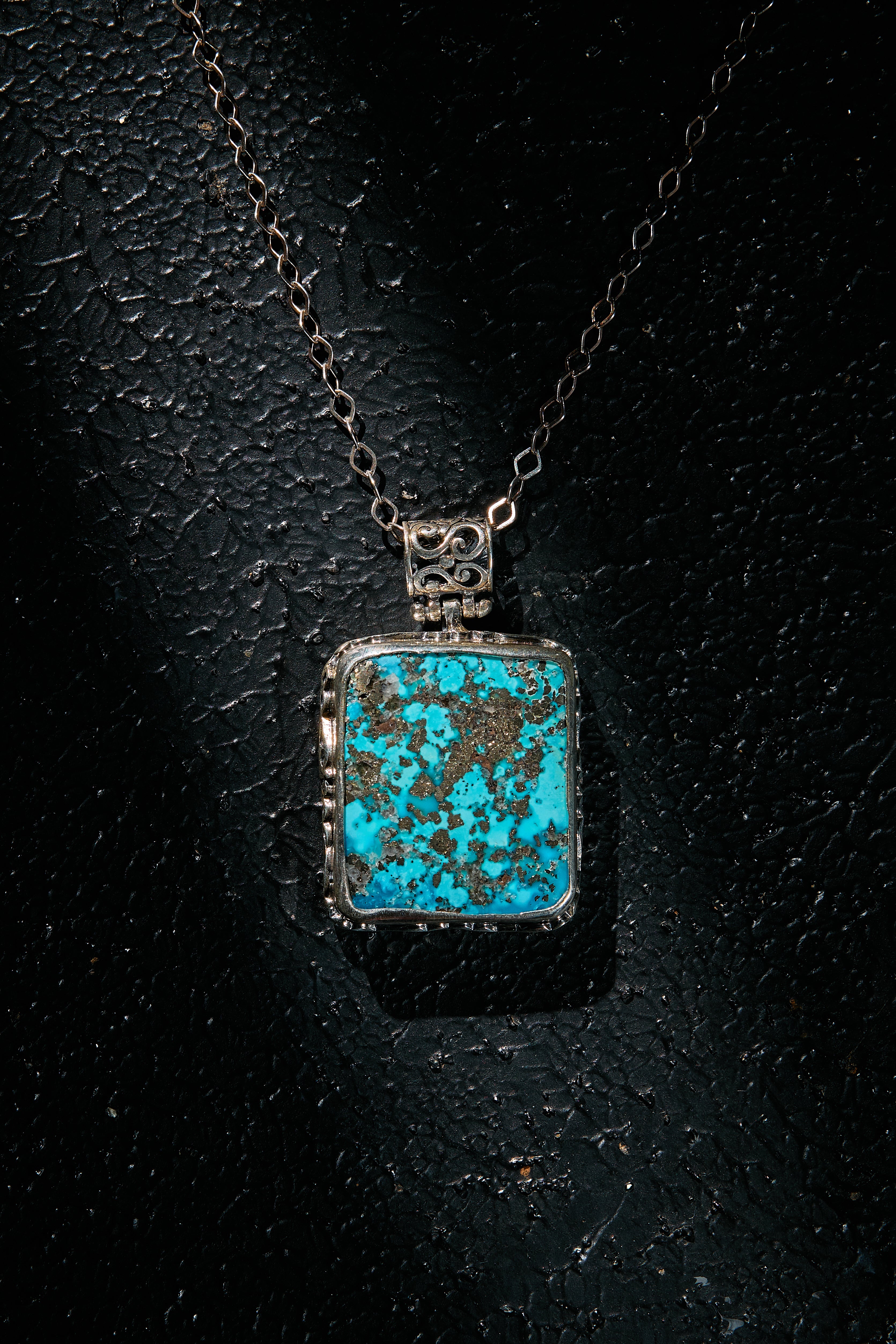This is a huge, iconic pendant where calm turquoise meets a live-wire spark: natural silver pyrite dots flash like lightning brainwaves inside the blue, giving you clean jolts of energy to move—now—and have your path illuminated with fierce energy.