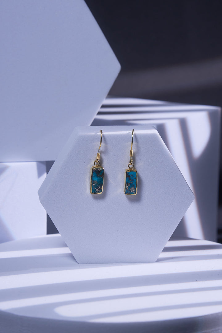 Two slim bars of deep turquoise are framed in warm finished 925 sterling silver, like tiny portals lit from within. Natural silver flecks flash across the stones like stardust on water, giving them extra electric sparks. You may see a crab or wise guide in the matrix- here to support you when needed.