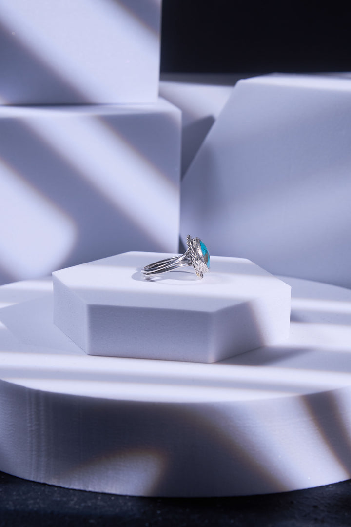 A turquoise snow globe with its own headliner inside- Lola, a sexy cabaret spirit with soft eyes, lips, and a silver mic-pole of light. The braided 925 silver frame becomes her stage curtain; the rare, speckled blue is the spotlight. A backstage pass to confidence at your fingertips.