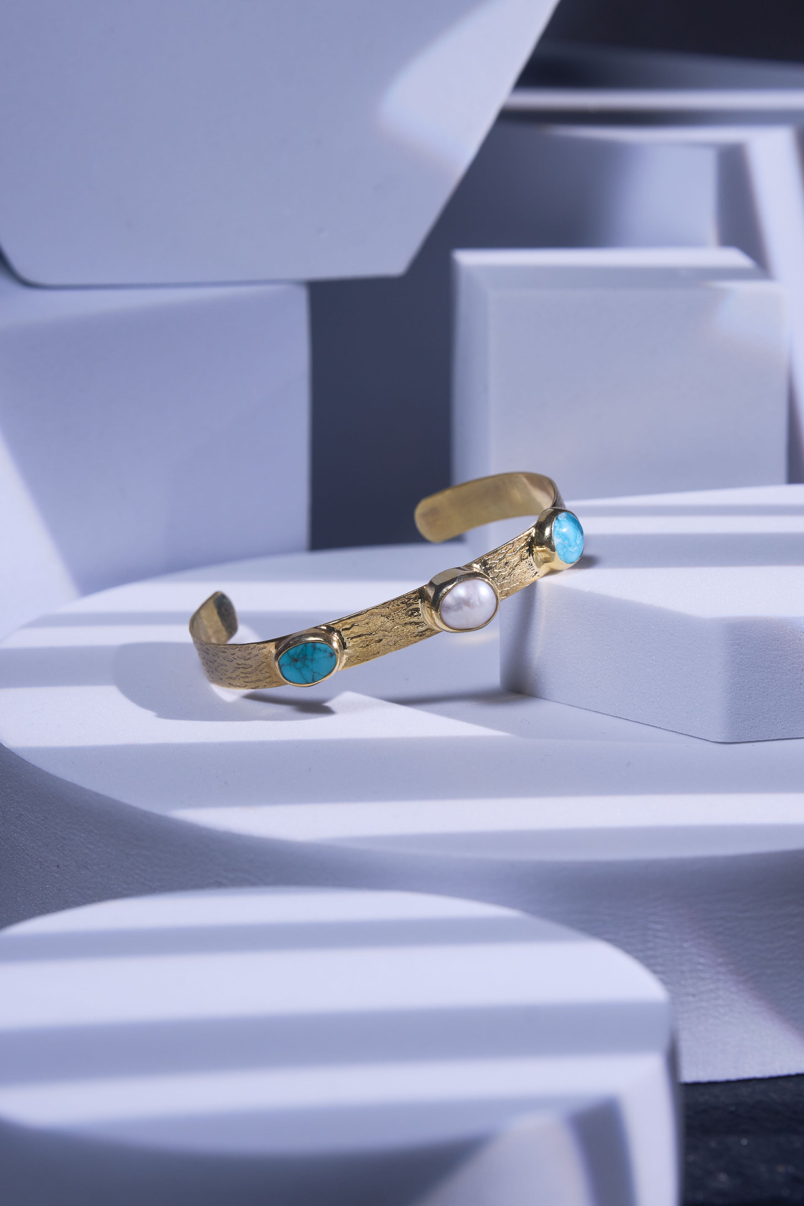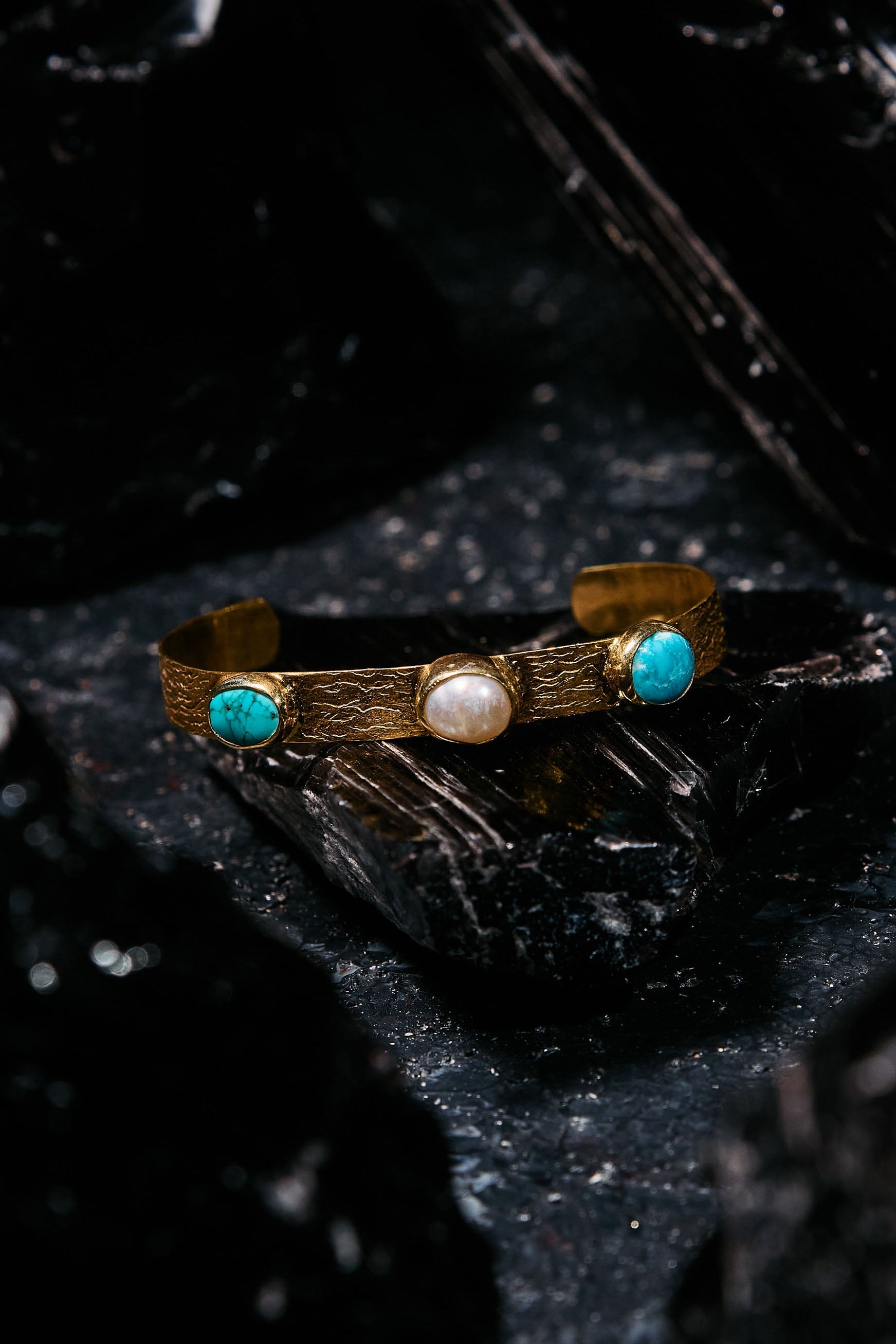 Hammered golden cuff with twin turquoise stones and a soft pearl center—like Nile blue and moonlight captured in one royal band. A quiet Cleopatra piece to help you claim your space, adorn yourself, and reign over your day.